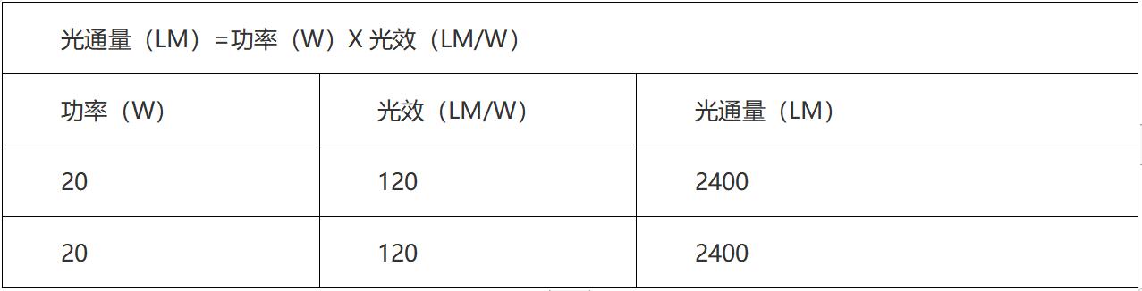 表1:同樣的功率,同樣的光效,亮度一樣。
