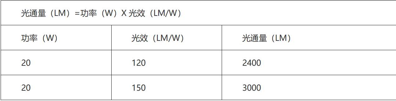 表2:同樣的功率,不同的光效,亮度不一樣,光效越高越亮。