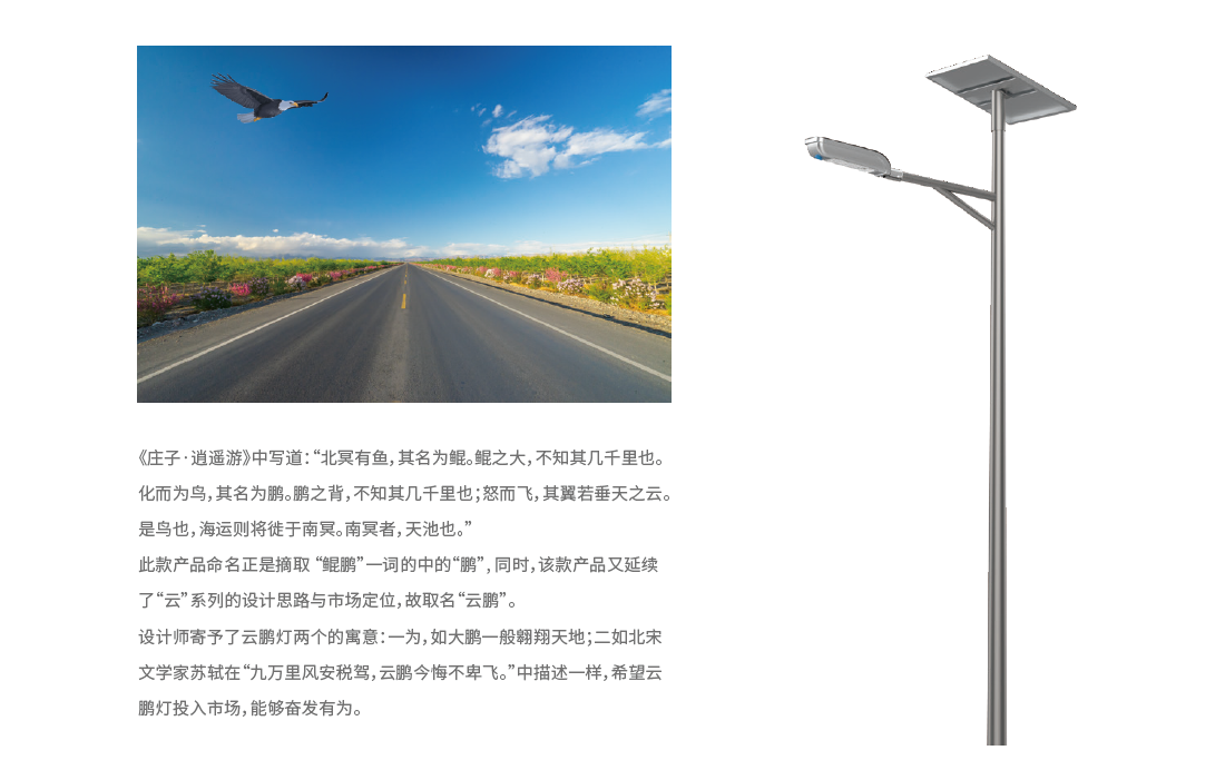 云鵬燈作為中大功率分體式太陽(yáng)能路燈,被廣泛應(yīng)用于新農(nóng)村道路、鄉(xiāng)鎮(zhèn)道路、城郊車道等6-10米的安裝場(chǎng)景。